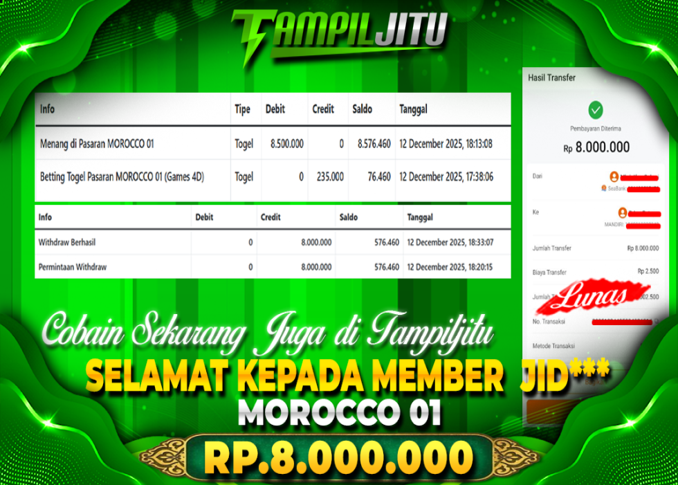 Selamat kepada User id : JID*** Telah berhasil mendapatkan kemenangan besar pada permainan MOROCCO 1 kemenangan Sebesar Rp.8.000.000, Setelah mengisi formulir withdraw dengan kurung waktu hanya 5 – 10 menit pihak tampiljitu sudah melakukan transfer kepada pemilik Userid dan dana sudah dapat di cairkan oleh pemenang. Bukti pembayaran yang kami berikan merupakan bukti pembayaran yang SAH / VALID yang langung di dapatkan melaui tanda transfer transaksi dari Bank yang di tuju.