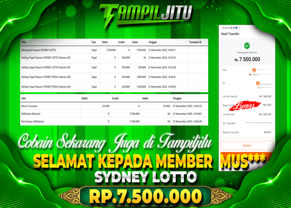 Selamat kepada User id : MUS*** Telah berhasil mendapatkan kemenangan besar pada permainan SYDNEY LOTTO kemenangan Sebesar Rp.7.500.000, Setelah mengisi formulir withdraw dengan kurung waktu hanya 5 – 10 menit pihak tampiljitu sudah melakukan transfer kepada pemilik Userid dan dana sudah dapat di cairkan oleh pemenang. Bukti pembayaran yang kami berikan merupakan bukti pembayaran yang SAH / VALID yang langung di dapatkan melaui tanda transfer transaksi dari Bank yang di tuju.