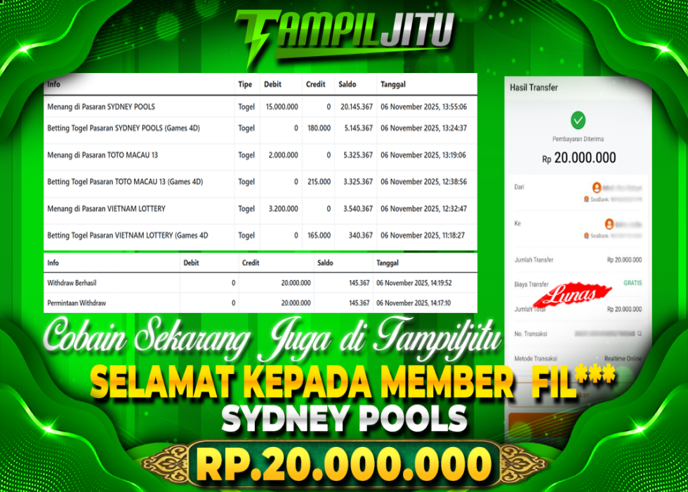 Selamat kepada User id : FIL*** Telah berhasil mendapatkan kemenangan besar pada permainan SYDNEY POOLS kemenangan Sebesar Rp.20.000.000, Setelah mengisi formulir withdraw dengan kurung waktu hanya 5 – 10 menit pihak tampiljitu sudah melakukan transfer kepada pemilik Userid dan dana sudah dapat di cairkan oleh pemenang. Bukti pembayaran yang kami berikan merupakan bukti pembayaran yang SAH / VALID yang langung di dapatkan melaui tanda transfer transaksi dari Bank yang di tuju.