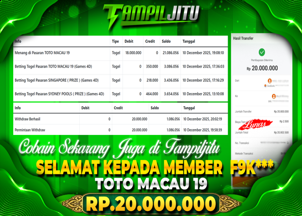 Selamat kepada User id : F9K*** Telah berhasil mendapatkan kemenangan besar pada permainan TOTO MACAU 19 kemenangan Sebesar Rp.20.000.000, Setelah mengisi formulir withdraw dengan kurung waktu hanya 5 – 10 menit pihak tampiljitu sudah melakukan transfer kepada pemilik Userid dan dana sudah dapat di cairkan oleh pemenang. Bukti pembayaran yang kami berikan merupakan bukti pembayaran yang SAH / VALID yang langung di dapatkan melaui tanda transfer transaksi dari Bank yang di tuju.