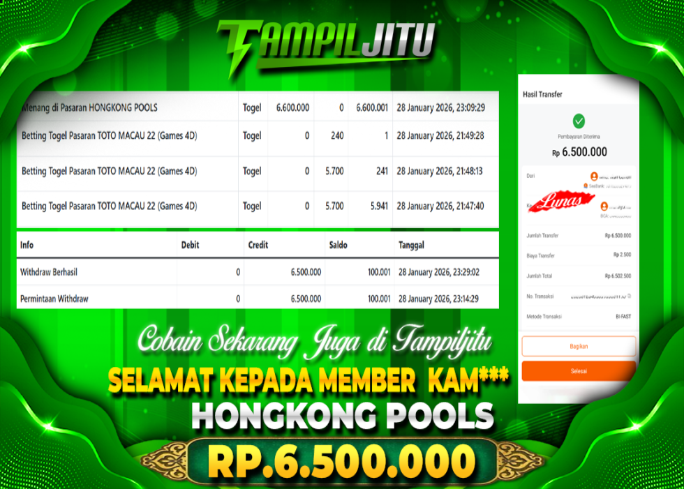 Selamat kepada User id : KAM*** Telah berhasil mendapatkan kemenangan besar pada permainan HONGKONG POOLS kemenangan Sebesar Rp.6.500.000, Setelah mengisi formulir withdraw dengan kurung waktu hanya 5 – 10 menit pihak tampiljitu sudah melakukan transfer kepada pemilik Userid dan dana sudah dapat di cairkan oleh pemenang. Bukti pembayaran yang kami berikan merupakan bukti pembayaran yang SAH / VALID yang langung di dapatkan melaui tanda transfer transaksi dari Bank yang di tuju.