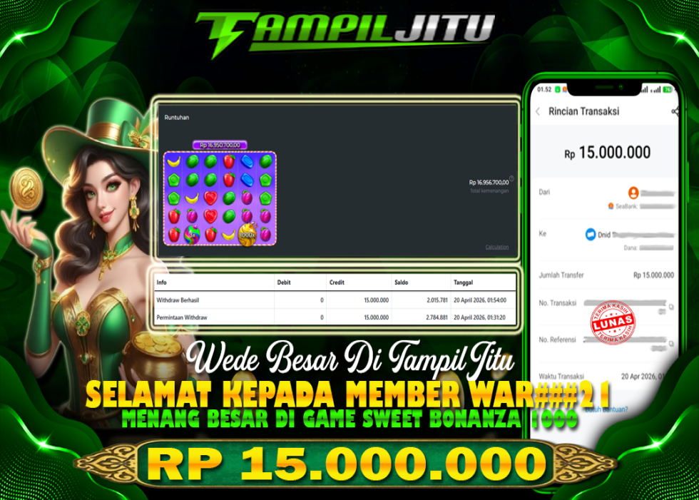 Selamat kepada User id : WAR*** Telah berhasil mendapatkan kemenangan besar pada permainan SLOT Sweet Bonanza 1000 kemenangan Sebesar Rp.15.000.000, Setelah mengisi formulir withdraw dengan kurung waktu hanya 5 – 10 menit pihak tampiljitu sudah melakukan transfer kepada pemilik Userid dan dana sudah dapat di cairkan oleh pemenang. Bukti pembayaran yang kami berikan merupakan bukti pembayaran yang SAH / VALID yang langung di dapatkan melaui tanda transfer transaksi dari Bank yang di tuju.