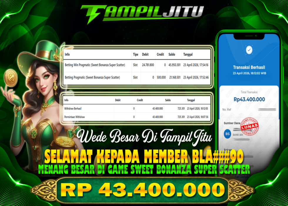 Selamat kepada User id : BLA*** Telah berhasil mendapatkan kemenangan besar pada permainan SLOT Sweet Bonanza Super Scatter kemenangan Sebesar Rp.43.400.000, Setelah mengisi formulir withdraw dengan kurung waktu hanya 5 – 10 menit pihak tampiljitu sudah melakukan transfer kepada pemilik Userid dan dana sudah dapat di cairkan oleh pemenang. Bukti pembayaran yang kami berikan merupakan bukti pembayaran yang SAH / VALID yang langung di dapatkan melaui tanda transfer transaksi dari Bank yang di tuju.