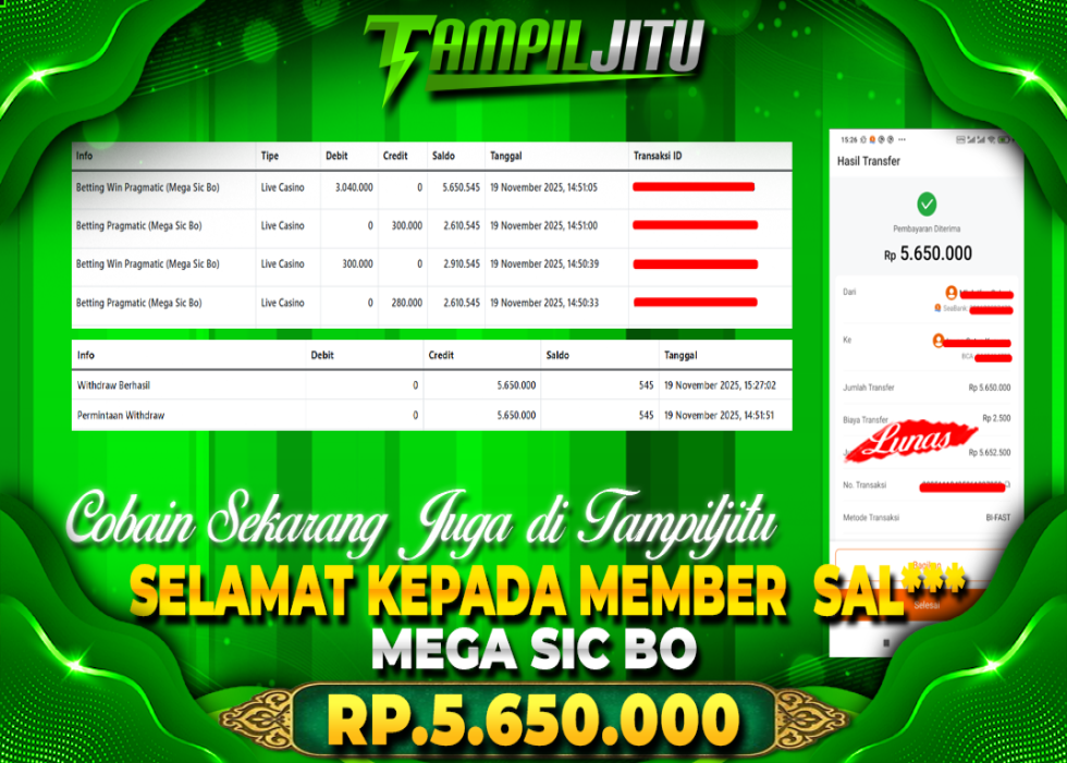 Selamat kepada User id : SAL*** Telah berhasil mendapatkan kemenangan besar pada permainan LIVE CASINO MEGA SIC BO kemenangan Sebesar Rp.5.650.000, Setelah mengisi formulir withdraw dengan kurung waktu hanya 5 – 10 menit pihak tampiljitu sudah melakukan transfer kepada pemilik Userid dan dana sudah dapat di cairkan oleh pemenang. Bukti pembayaran yang kami berikan merupakan bukti pembayaran yang SAH / VALID yang langung di dapatkan melaui tanda transfer transaksi dari Bank yang di tuju.