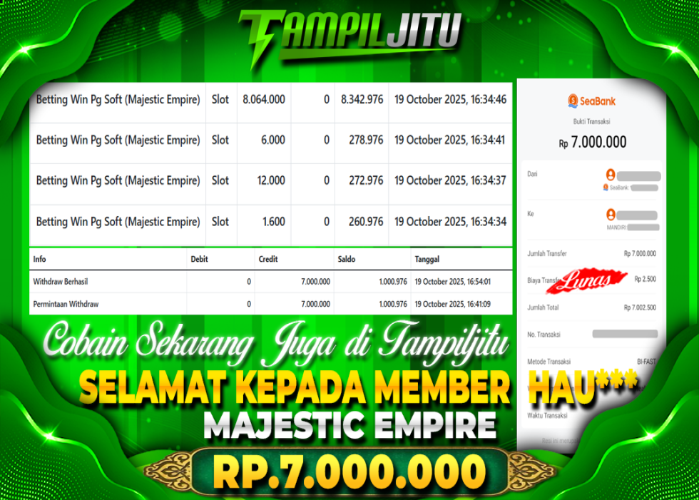 Selamat kepada User id HAU*** Telah berhasil mendapatkan kemenangan besar pada permainan MAJESTIC EMPIRE kemenangan Sebesar Rp.7.000.000, Setelah mengisi formulir withdraw dengan kurung waktu hanya 5 – 10 menit pihak tampiljitu sudah melakukan transfer kepada pemilik Userid dan dana sudah dapat di cairkan oleh pemenang. Bukti pembayaran yang kami berikan merupakan bukti pembayaran yang SAH / VALID yang langung di dapatkan melaui tanda transfer transaksi dari Bank yang di tuju.