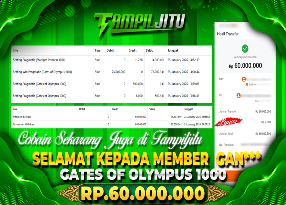 Selamat kepada User id :GAN*** Telah berhasil mendapatkan kemenangan besar pada permainan SLOT GATES OF OLYMPUS 1000 kemenangan Sebesar Rp.60.000.000, Setelah mengisi formulir withdraw dengan kurung waktu hanya 5 – 10 menit pihak tampiljitu sudah melakukan transfer kepada pemilik Userid dan dana sudah dapat di cairkan oleh pemenang. Bukti pembayaran yang kami berikan merupakan bukti pembayaran yang SAH / VALID yang langung di dapatkan melaui tanda transfer transaksi dari Bank yang di tuju.