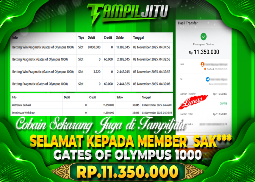 Selamat kepada User id : SAK*** Telah berhasil mendapatkan kemenangan besar pada permainan SLOT GATES OF OLYMPUS 1000 kemenangan Sebesar Rp.11.350.000, Setelah mengisi formulir withdraw dengan kurung waktu hanya 5 – 10 menit pihak tampiljitu sudah melakukan transfer kepada pemilik Userid dan dana sudah dapat di cairkan oleh pemenang. Bukti pembayaran yang kami berikan merupakan bukti pembayaran yang SAH / VALID yang langung di dapatkan melaui tanda transfer transaksi dari Bank yang di tuju.