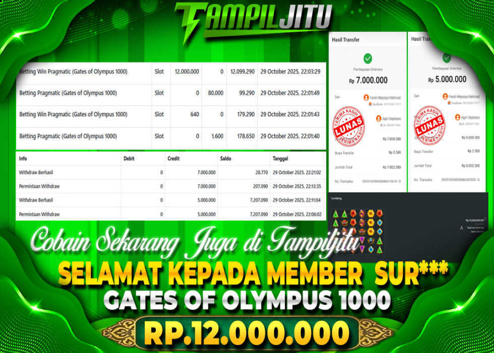 Selamat kepada User id : SUR*** Telah berhasil mendapatkan kemenangan besar pada permainan SLOT GATES OF OLYMPUS 1000 kemenangan Sebesar Rp.12.000.000, Setelah mengisi formulir withdraw dengan kurung waktu hanya 5 – 10 menit pihak tampiljitu sudah melakukan transfer kepada pemilik Userid dan dana sudah dapat di cairkan oleh pemenang. Bukti pembayaran yang kami berikan merupakan bukti pembayaran yang SAH / VALID yang langung di dapatkan melaui tanda transfer transaksi dari Bank yang di tuju.