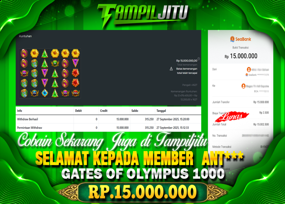 Selamat kepada User id : ANT*** Telah berhasil mendapatkan kemenangan besar pada permainan SLOT GATES OF OLYMPUS 1000 kemenangan Sebesar Rp.15.000.000, Setelah mengisi formulir withdraw dengan kurung waktu hanya 5 – 10 menit pihak tampiljitu sudah melakukan transfer kepada pemilik Userid dan dana sudah dapat di cairkan oleh pemenang. Bukti pembayaran yang kami berikan merupakan bukti pembayaran yang SAH / VALID yang langung di dapatkan melaui tanda transfer transaksi dari Bank yang di tuju.