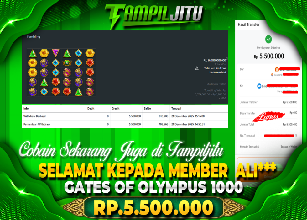 Selamat kepada User id : ALI*** Telah berhasil mendapatkan kemenangan besar pada permainan SLOT GATES OF OLYMPUS 1000 kemenangan Sebesar Rp.5.500.000, Setelah mengisi formulir withdraw dengan kurung waktu hanya 5 – 10 menit pihak tampiljitu sudah melakukan transfer kepada pemilik Userid dan dana sudah dapat di cairkan oleh pemenang. Bukti pembayaran yang kami berikan merupakan bukti pembayaran yang SAH / VALID yang langung di dapatkan melaui tanda transfer transaksi dari Bank yang di tuju.