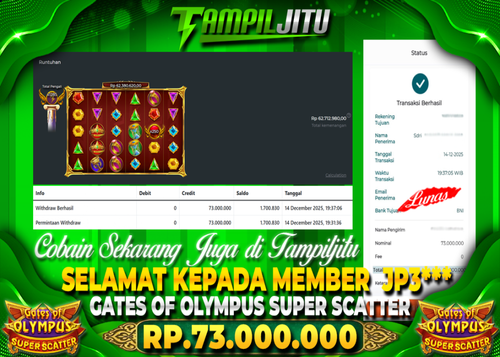 Selamat kepada User id : JP3*** Telah berhasil mendapatkan kemenangan besar pada permainan SLOT GATES OF OLYMPUS SUPER SCATTER kemenangan Sebesar Rp.73.000.000, Setelah mengisi formulir withdraw dengan kurung waktu hanya 5 – 10 menit pihak tampiljitu sudah melakukan transfer kepada pemilik Userid dan dana sudah dapat di cairkan oleh pemenang. Bukti pembayaran yang kami berikan merupakan bukti pembayaran yang SAH / VALID yang langung di dapatkan melaui tanda transfer transaksi dari Bank yang di tuju.