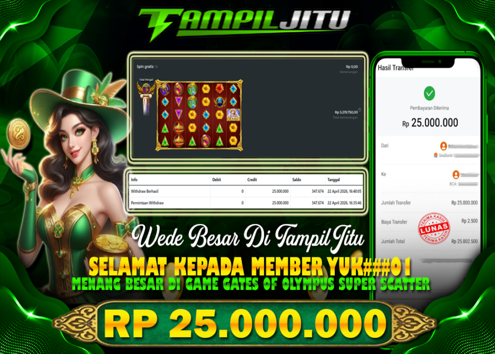 Selamat kepada User id : YUK*** Telah berhasil mendapatkan kemenangan besar pada permainan SLOT GATES OF OLYMPUS SUPER SCATTER kemenangan Sebesar Rp.25.000.000, Setelah mengisi formulir withdraw dengan kurung waktu hanya 5 – 10 menit pihak tampiljitu sudah melakukan transfer kepada pemilik Userid dan dana sudah dapat di cairkan oleh pemenang. Bukti pembayaran yang kami berikan merupakan bukti pembayaran yang SAH / VALID yang langung di dapatkan melaui tanda transfer transaksi dari Bank yang di tuju.