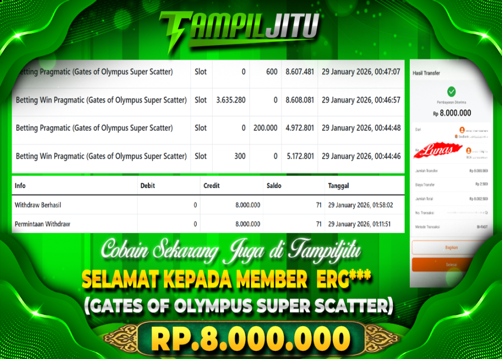 Selamat kepada User id : ERG*** Telah berhasil mendapatkan kemenangan besar pada permainan SLOT GATES OF OLYMPUS SUPER SCATTER kemenangan Sebesar Rp.8.000.000, Setelah mengisi formulir withdraw dengan kurung waktu hanya 5 – 10 menit pihak tampiljitu sudah melakukan transfer kepada pemilik Userid dan dana sudah dapat di cairkan oleh pemenang. Bukti pembayaran yang kami berikan merupakan bukti pembayaran yang SAH / VALID yang langung di dapatkan melaui tanda transfer transaksi dari Bank yang di tuju.