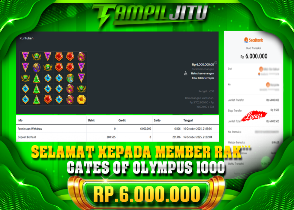 Selamat kepada User id : RAK*** Telah berhasil mendapatkan kemenangan besar pada permainan SLOT GATES OF OLYMPUS 1000 kemenangan Sebesar Rp.6.000.000, Setelah mengisi formulir withdraw dengan kurung waktu hanya 5 – 10 menit pihak tampiljitu sudah melakukan transfer kepada pemilik Userid dan dana sudah dapat di cairkan oleh pemenang. Bukti pembayaran yang kami berikan merupakan bukti pembayaran yang SAH / VALID yang langung di dapatkan melaui tanda transfer transaksi dari Bank yang di tuju.