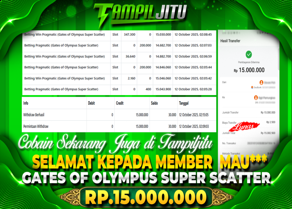Selamat kepada User id :MAU*** Telah berhasil mendapatkan kemenangan besar pada permainan SLOT GATES OLYMPUS SUPER SCATTER kemenangan Sebesar Rp.15.000.000, Setelah mengisi formulir withdraw dengan kurung waktu hanya 5 – 10 menit pihak tampiljitu sudah melakukan transfer kepada pemilik Userid dan dana sudah dapat di cairkan oleh pemenang. Bukti pembayaran yang kami berikan merupakan bukti pembayaran yang SAH / VALID yang langung di dapatkan melaui tanda transfer transaksi dari Bank yang di tuju.