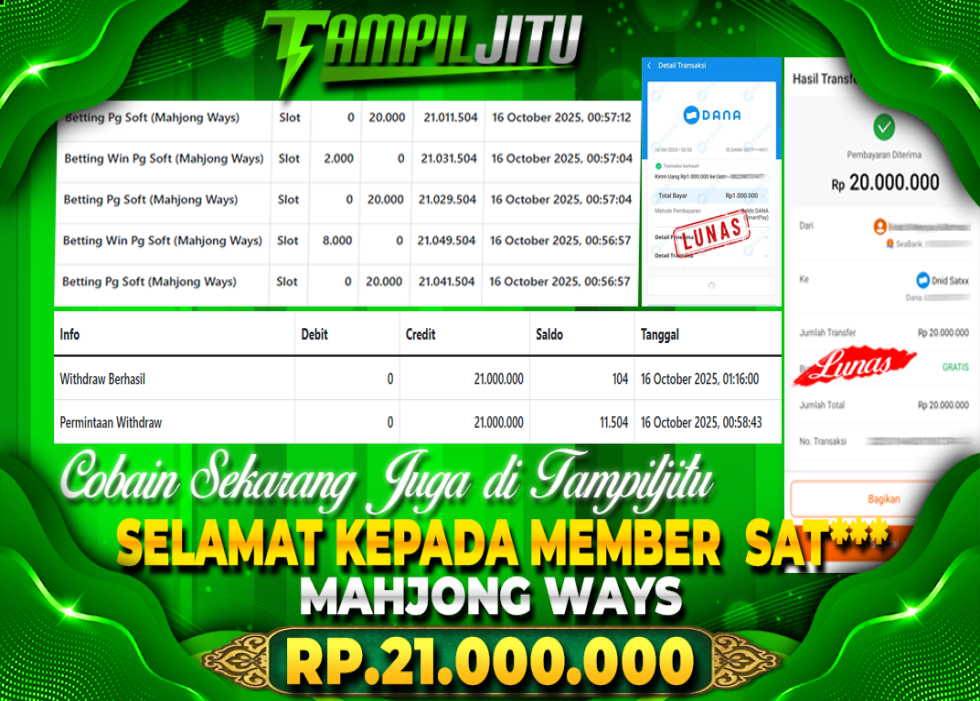Selamat kepada User id SAT*** Telah berhasil mendapatkan kemenangan besar pada permainan SLOT MAHJONG WAYS kemenangan Sebesar Rp.21.000.000, Setelah mengisi formulir withdraw dengan kurung waktu hanya 5 – 10 menit pihak tampiljitu sudah melakukan transfer kepada pemilik Userid dan dana sudah dapat di cairkan oleh pemenang. Bukti pembayaran yang kami berikan merupakan bukti pembayaran yang SAH / VALID yang langung di dapatkan melaui tanda transfer transaksi dari Bank yang di tuju.