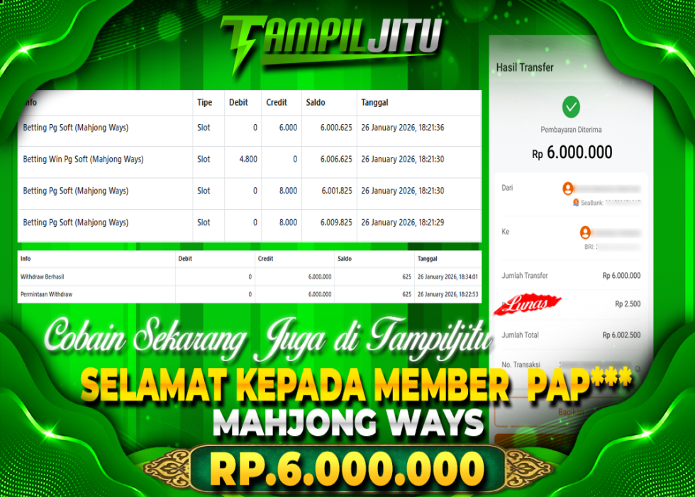 Selamat kepada User id : PAP*** Telah berhasil mendapatkan kemenangan besar pada permainan SLOT MAHJONG WAYS kemenangan Sebesar Rp.6.000.000, Setelah mengisi formulir withdraw dengan kurung waktu hanya 5 – 10 menit pihak tampiljitu sudah melakukan transfer kepada pemilik Userid dan dana sudah dapat di cairkan oleh pemenang. Bukti pembayaran yang kami berikan merupakan bukti pembayaran yang SAH / VALID yang langung di dapatkan melaui tanda transfer transaksi dari Bank yang di tuju.
