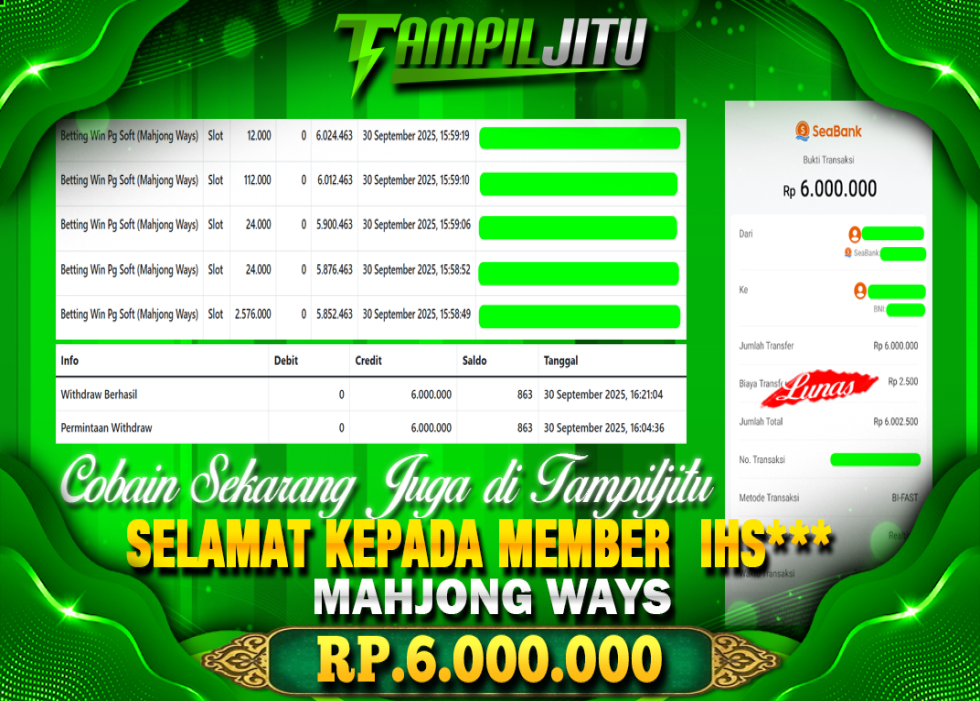 Selamat kepada User id :IHS*** Telah berhasil mendapatkan kemenangan besar pada permainan SLOT MAHJONG WAYS kemenangan Sebesar Rp.6.000.000, Setelah mengisi formulir withdraw dengan kurung waktu hanya 5 – 10 menit pihak tampiljitu sudah melakukan transfer kepada pemilik Userid dan dana sudah dapat di cairkan oleh pemenang. Bukti pembayaran yang kami berikan merupakan bukti pembayaran yang SAH / VALID yang langung di dapatkan melaui tanda transfer transaksi dari Bank yang di tuju.