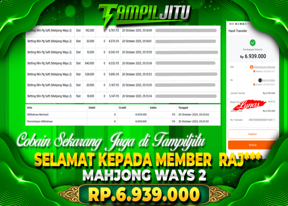 Selamat kepada User id RAJ*** Telah berhasil mendapatkan kemenangan besar pada permainan SLOT MAHJONG WAYS 2 kemenangan Sebesar Rp.6.939.000, Setelah mengisi formulir withdraw dengan kurung waktu hanya 5 – 10 menit pihak tampiljitu sudah melakukan transfer kepada pemilik Userid dan dana sudah dapat di cairkan oleh pemenang. Bukti pembayaran yang kami berikan merupakan bukti pembayaran yang SAH / VALID yang langung di dapatkan melaui tanda transfer transaksi dari Bank yang di tuju.