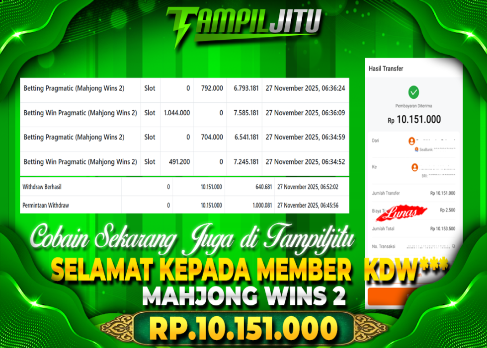 Selamat kepada User id : KDW*** Telah berhasil mendapatkan kemenangan besar pada permainan SLOT MAHJONG WINS 2 kemenangan Sebesar Rp.10.151.000, Setelah mengisi formulir withdraw dengan kurung waktu hanya 5 – 10 menit pihak tampiljitu sudah melakukan transfer kepada pemilik Userid dan dana sudah dapat di cairkan oleh pemenang. Bukti pembayaran yang kami berikan merupakan bukti pembayaran yang SAH / VALID yang langung di dapatkan melaui tanda transfer transaksi dari Bank yang di tuju.