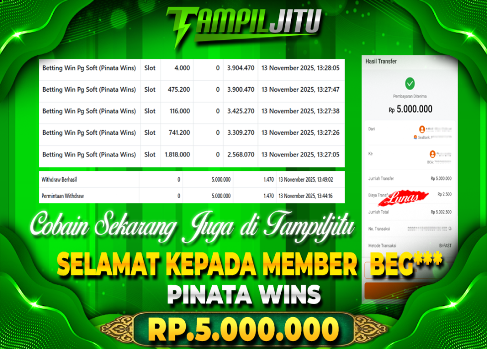 Selamat kepada User id : BEG*** Telah berhasil mendapatkan kemenangan besar pada permainan SLOT PINATA WINS kemenangan Sebesar Rp.5.000.000, Setelah mengisi formulir withdraw dengan kurung waktu hanya 5 – 10 menit pihak tampiljitu sudah melakukan transfer kepada pemilik Userid dan dana sudah dapat di cairkan oleh pemenang. Bukti pembayaran yang kami berikan merupakan bukti pembayaran yang SAH / VALID yang langung di dapatkan melaui tanda transfer transaksi dari Bank yang di tuju.