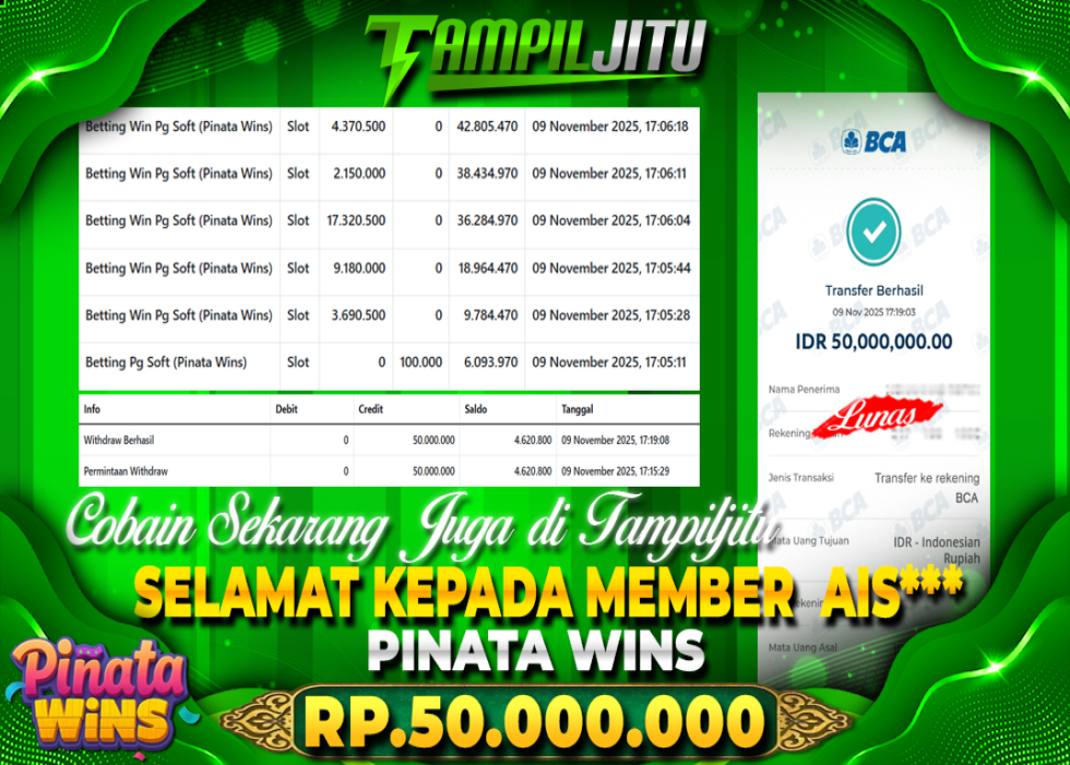 Selamat kepada User id : AIS*** Telah berhasil mendapatkan kemenangan besar pada permainan SLOT PINATA WINS kemenangan Sebesar Rp.50.00.000, Setelah mengisi formulir withdraw dengan kurung waktu hanya 5 – 10 menit pihak tampiljitu sudah melakukan transfer kepada pemilik Userid dan dana sudah dapat di cairkan oleh pemenang. Bukti pembayaran yang kami berikan merupakan bukti pembayaran yang SAH / VALID yang langung di dapatkan melaui tanda transfer transaksi dari Bank yang di tuju.