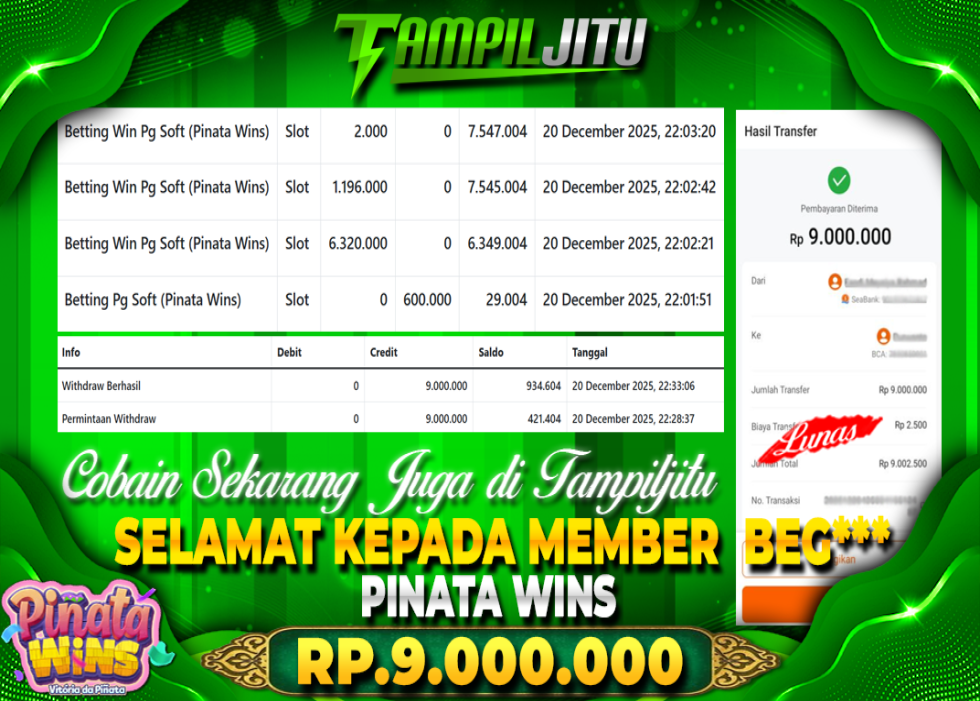 Selamat kepada User id : BEC*** Telah berhasil mendapatkan kemenangan besar pada permainan SLOT PINATA WINS kemenangan Sebesar Rp.9.00.000, Setelah mengisi formulir withdraw dengan kurung waktu hanya 5 – 10 menit pihak tampiljitu sudah melakukan transfer kepada pemilik Userid dan dana sudah dapat di cairkan oleh pemenang. Bukti pembayaran yang kami berikan merupakan bukti pembayaran yang SAH / VALID yang langung di dapatkan melaui tanda transfer transaksi dari Bank yang di tuju.