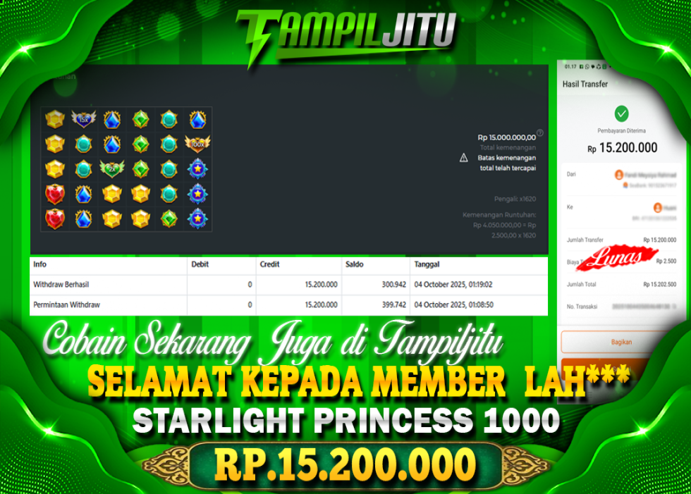 Selamat kepada User id : LAH*** Telah berhasil mendapatkan kemenangan besar pada permainan SLOT STARLIGHT PRINCESS 1000 kemenangan Sebesar Rp.15.200.000, Setelah mengisi formulir withdraw dengan kurung waktu hanya 5 – 10 menit pihak tampiljitu sudah melakukan transfer kepada pemilik Userid dan dana sudah dapat di cairkan oleh pemenang. Bukti pembayaran yang kami berikan merupakan bukti pembayaran yang SAH / VALID yang langung di dapatkan melaui tanda transfer transaksi dari Bank yang di tuju.