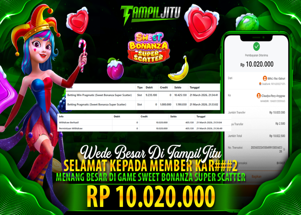 Selamat kepada User id : KAR*** Telah berhasil mendapatkan kemenangan besar pada permainan SLOT SWEET BONANZA SUPER SCATTER kemenangan Sebesar Rp.10.020.000, Setelah mengisi formulir withdraw dengan kurung waktu hanya 5 – 10 menit pihak tampiljitu sudah melakukan transfer kepada pemilik Userid dan dana sudah dapat di cairkan oleh pemenang. Bukti pembayaran yang kami berikan merupakan bukti pembayaran yang SAH / VALID yang langung di dapatkan melaui tanda transfer transaksi dari Bank yang di tuju.