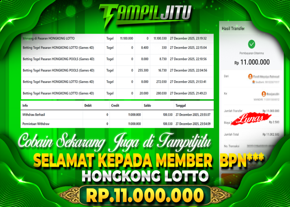 Selamat kepada User id : BPN*** Telah berhasil mendapatkan kemenangan besar pada permainan HONGKOGN LOTTO kemenangan Sebesar Rp.11.000.000, Setelah mengisi formulir withdraw dengan kurung waktu hanya 5 – 10 menit pihak tampiljitu sudah melakukan transfer kepada pemilik Userid dan dana sudah dapat di cairkan oleh pemenang. Bukti pembayaran yang kami berikan merupakan bukti pembayaran yang SAH / VALID yang langung di dapatkan melaui tanda transfer transaksi dari Bank yang di tuju.