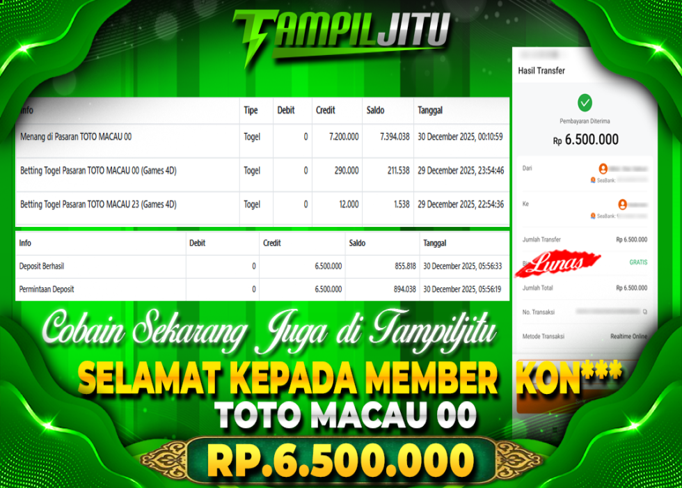 Selamat kepada User id : KON*** Telah berhasil mendapatkan kemenangan besar pada permainan TOTO MACAU 00 kemenangan Sebesar Rp.9.750.000, Setelah mengisi formulir withdraw dengan kurung waktu hanya 5 – 10 menit pihak tampiljitu sudah melakukan transfer kepada pemilik Userid dan dana sudah dapat di cairkan oleh pemenang. Bukti pembayaran yang kami berikan merupakan bukti pembayaran yang SAH / VALID yang langung di dapatkan melaui tanda transfer transaksi dari Bank yang di tuju.