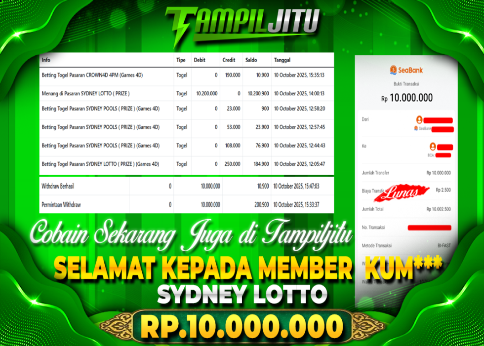 Selamat kepada User id : KUM*** Telah berhasil mendapatkan kemenangan besar pada permainan SYDNEY LOTTO kemenangan Sebesar Rp.10.000.000, Setelah mengisi formulir withdraw dengan kurung waktu hanya 5 – 10 menit pihak tampiljitu sudah melakukan transfer kepada pemilik Userid dan dana sudah dapat di cairkan oleh pemenang. Bukti pembayaran yang kami berikan merupakan bukti pembayaran yang SAH / VALID yang langung di dapatkan melaui tanda transfer transaksi dari Bank yang di tuju.