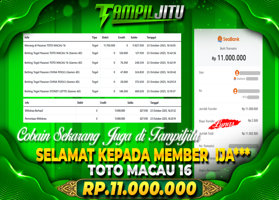 Selamat kepada User id : IJA*** Telah berhasil mendapatkan kemenangan besar pada permainan TOTO MACAU 16 kemenangan Sebesar Rp.11.000.000, Setelah mengisi formulir withdraw dengan kurung waktu hanya 5 – 10 menit pihak tampiljitu sudah melakukan transfer kepada pemilik Userid dan dana sudah dapat di cairkan oleh pemenang. Bukti pembayaran yang kami berikan merupakan bukti pembayaran yang SAH / VALID yang langung di dapatkan melaui tanda transfer transaksi dari Bank yang di tuju.